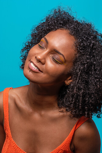 Caption:Calm positive African American female fashion model in casual wear with curly hair smiling with closed eyes against blue background