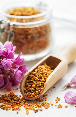 Caption:Healthy bee pollen grains. Bee pollen on a glass jar and acacia tree